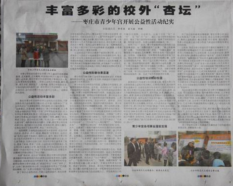 近日,在枣庄日报发表了一篇《丰富多彩的校外“杏坛"》 --枣庄市青少年宫开展公益性活动纪实