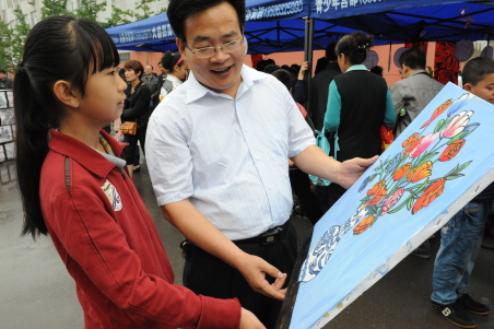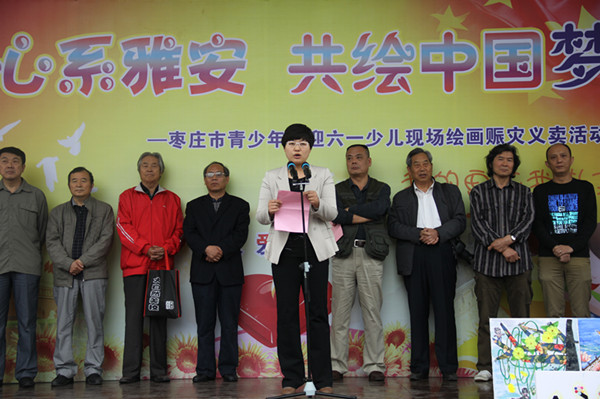 5月18日,在枣庄市青少年宫主楼前广场,由枣庄市青少年宫主办,市中区美协和大自然美校协办的“童心系雅安 共绘中国梦 ”枣庄市青少年宫迎六一少儿现场绘画赈灾义卖活动隆重举行,团市委副书记周慧在开幕式上致辞。