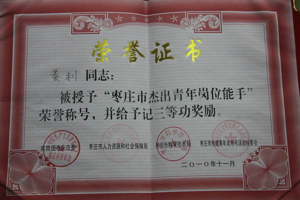 2010年,我宫办公室主任秦利同志立足于本职岗位,努力学习新知识,掌握更多的新技能,创造出了崭新的业绩。被团市委、市人力资源和社会保障局、市科技局和市创建青年文明号活动组委会授予第二届“枣庄市杰出青年岗位能手”称号,并记三等功奖励。