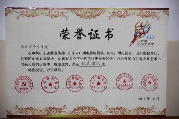 近日,我宫在中共山东省委宣传部、山东省广播电影电视局、山东广播电视台、山东省教育厅、共青团山东省委员会、山东省关心下一代工作委员会联合主办的首届山东省少儿艺术节书画大赛中荣获优秀组织奖。