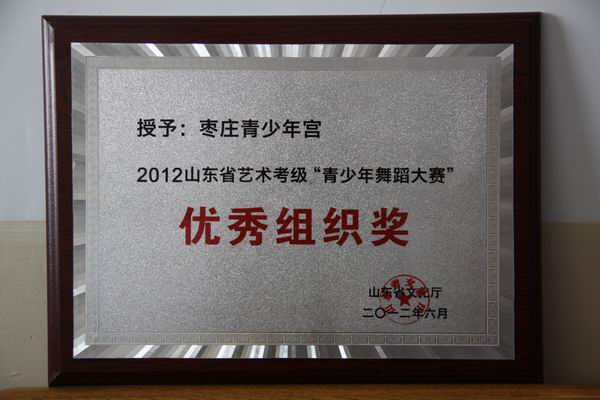 枣庄市青少年宫在今年举行的2012年山东省艺术考级“青少年舞蹈大赛”中被山东省文化厅评为优秀组织奖。舞蹈教师刘茹等六位老师评为“优秀辅导教师”和优秀创编奖”。