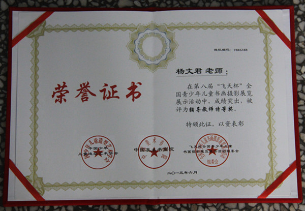 5月,我宫“深度画室”的杨文君老师收到了一份沉甸甸的礼物——由第八届“飞天杯”全国青少年书画大赛组委会寄来的获奖证书。据悉,在此次全国性的展览展示比赛活动中,“深度画室”学员充分发挥创造力和想象力,成绩斐然,共有45人入选并获奖。其中杨成海荣获全国青少年组素描绘画特等奖;宋雅琪荣获儿童组色彩绘画特等奖。荆文琪、武文卿、李博等24名学员获一等奖,青少年宫也再次获得艺术教育成果集体二等奖的荣誉,杨文君老师被评为全国“辅导教师特等奖”,为我宫的艺术教育成果添上了华丽的一笔。