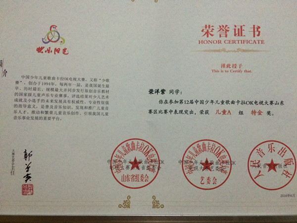 在枣庄市青少年声乐大赛中荣获一、二等奖的优秀的、具有代表枣庄城市声音的50余名少年儿童,由青少年宫组队参加了2016“快乐阳光”少歌赛山东赛区比赛。小歌手们用优美的歌声、丰富的表演形式、新颖的表现手法唱响全场,赢得了阵阵掌声和喝彩。经过复赛和决赛的激烈角逐,荣洋紫、米李可馨、王雅婕荣获特金奖;戴晓妍、王籽菡、丁子潇、黄传科等分别荣获金、银、铜奖;枣庄市青少年宫荣获