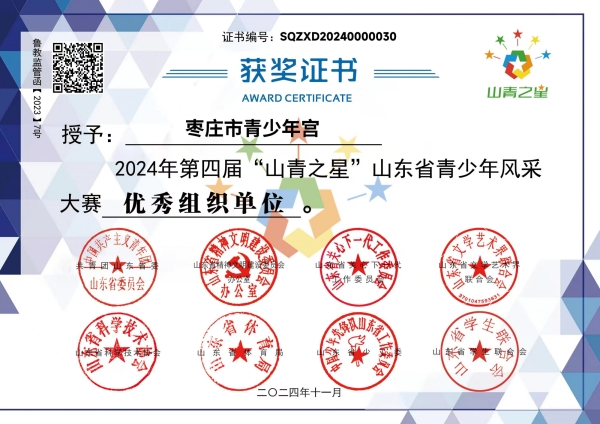 近日由共青团山东省委主办、省文明办、省体育局、省少工委等七部门支持的2024年第四届“山青之星”山东省青少年风采大赛中,枣庄市青少年宫凭借出色的组织工作和选手们优异表现,荣获了优秀组织单位。