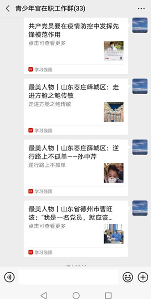 活动中学习了中共中央印发《关于加强党的领导、为打赢疫情防控阻击战提供坚强政治保证的通知》山东省直机关工委下发《关于发挥机关党建引领作用 扎实做好疫情防控工作的通知》枣庄市委市直机关工委《充分发挥市直机关基层战斗堡垒和党员先锋模范作用打赢新型冠状病毒感染的肺炎疫情防控阻击战的通知和中共中央召开统筹推进新冠肺炎疫情防控和经济社会发展工作部署会议的文件精神。并在职工微信工作群发布了学习强国平台推荐《共产党员要在疫情防控中发挥先锋模范作用》和在支援武汉抗击疫情和立足岗位做防控工作中的最美人物等多篇学习资料,部分党员同志结合学习活动在网上发表体会感悟,学习活动会上,党支部书记种燕同志要求,青少年宫党员及教职工要树立疫情防控是当前全宫首要工作任务的政治责任意识,要本着对党负责、对青少年负责的态度,做到居家学习不放松,居家办公不松懈,根据自身实际情况,结合当前疫情防控工作和青少年校外教育工作实际,积极发挥主观能动性,立足岗位,争先锋,做榜样,构筑群防群治的严密防线,为疫情防控尽己所能、多做实事。本次网上主题党日活动的开展,使学习强国线上平台发挥了强大作用,通过多措并举,有力拓展了青少年宫开展加强党员职工学习教育活动的新形式。