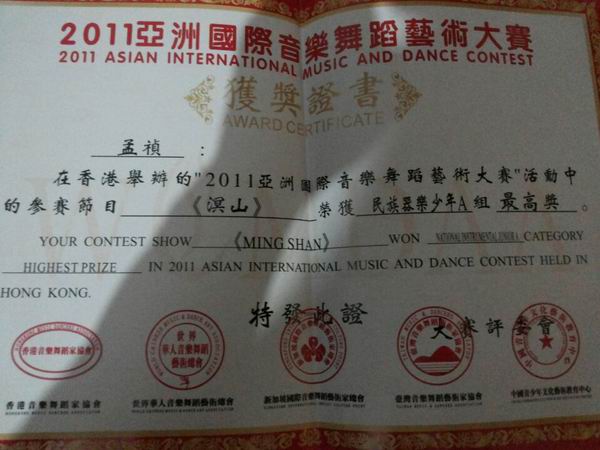 2011年在亚洲国际音乐舞蹈艺术大赛活动中荣获民族器乐少年A组最高奖;