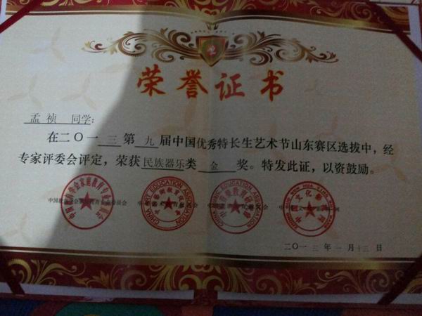 2013年在第九届中国优秀特长生艺术节荣获民族器乐类金奖;