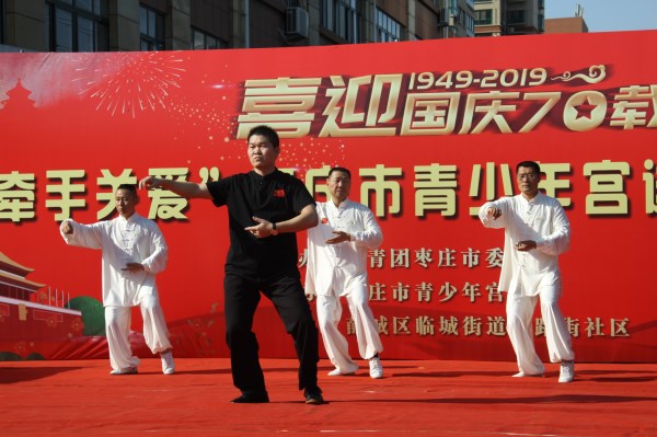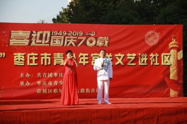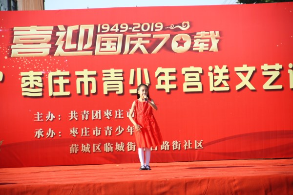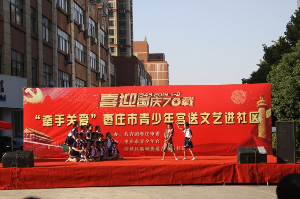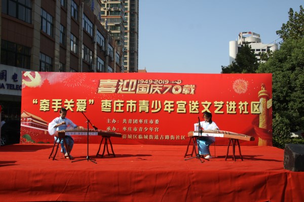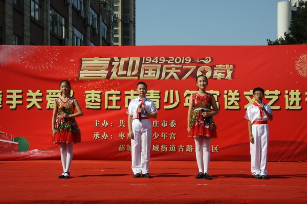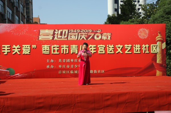 为庆祝新中国成立70周年,感受在习近平新时代中国特色社会主义思想的指引下,中国正迈步走向伟大的复兴新时代,由共青团枣庄市委主办,枣庄市青少年宫和古路街社区承办的喜迎国庆70载“牵手关爱”枣庄市青少年宫送文艺进社区活动于9月22日在薛城区临城街道古路街社区举行。