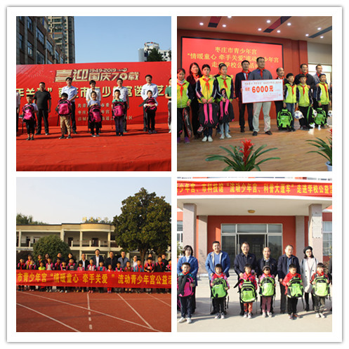 2019年,我宫作为中国宫协理事宫根据团中央、中国宫协关于开展“情暖童心―流动少年宫”的工程计划要求,走进薛城区古路街社区、涧头集镇中心小学和穆庄小学、山亭区外峪子小学开展以“流动少年宫”为主要活动形式的公益活动,为当地留守等困难儿童赠送了书籍、书包、文具、足球、羽毛球等文体用品,选派了我宫优秀专业教师,开展课堂教学。活动的开展得到团市委、教体局等部门的大力支持,更得到了数家爱心单位的资助。一年来,累计关爱贫困、留守儿童3000余名。