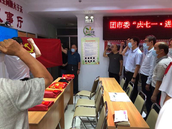 “我志愿加入中国共产党,拥护党的纲领……”,铮铮誓言,坚定有力。6月28日,在薛城区临城街道古路街社区党员活动室内,由团市委机关党委举办的“庆七一·进社区”主题党日活动正在庄重开展,市青少年宫党支部部分党员参加活动。