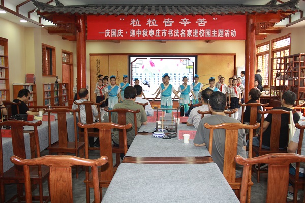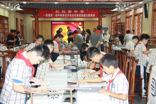 为贯彻落实习近平总书记在中国少年先锋队第八次全国代表大会上的贺信和“厉行勤俭节约、反对奢侈浪费”系列指示精神,庆祝伟大祖国71岁华诞,喜迎中华民族传统中秋佳节,落实省、市团委,少工委关于在青少年和少先队员中开展厉行节约反对浪费的倡议行动,市少工委、市语委办、市青少年宫、市青年书协于9月29日在市中区建设路小学东校共同举办“粒粒皆辛苦”——庆国庆·迎中秋枣庄市书法名家进校园专题活动。团市委四级调研员秦军同志、市语委办主任邱艳丽同志、市青少年宫主任种燕同志等领导及市书协的艺术家们出席参加了活动。