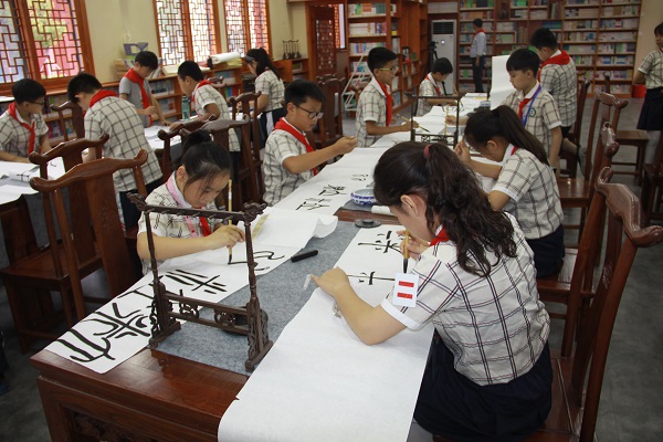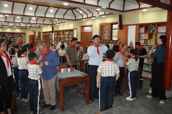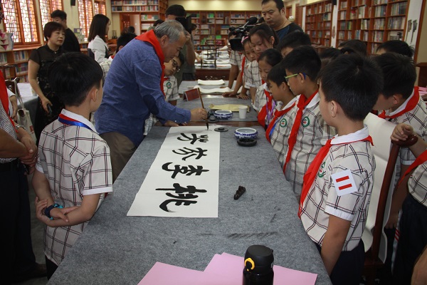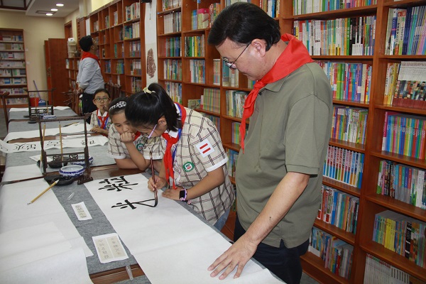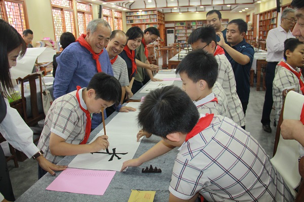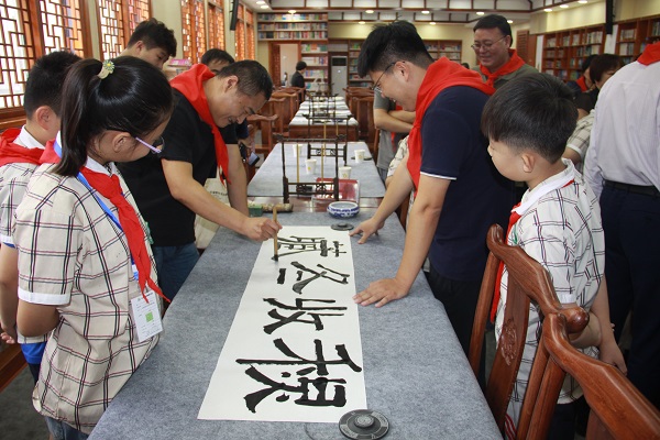 少先队员向与会领导和专家敬献红领巾。在悠扬、典雅的古筝曲中,书法名家现场挥毫泼墨。“桃李芬芳”“养德润身”“长风破浪”一笔一划既展现了书法家们的艺术风采,又蕴含着对老师的称颂和对同学们的殷殷期望。其中还有师生共同合作完成一件作品,更有书家现场指导,同学们提起毛笔细心临摹,大胆创作,表现了自己对书法的理解,在实践中学习并体会到书画艺术的魅力。活动现场气氛热烈,同学们对艺术家精湛的艺术表现惊叹不已;书法家们也对同学们的表现大加赞赏,鼓励同学们继续努力。
