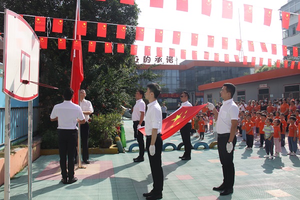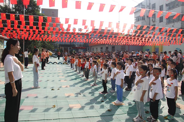 迎着初升的太阳,在庄严的国歌声中,鲜艳的五星红旗冉冉升起,老师、家长和孩子们齐唱国歌,向祖国母亲献上生日祝福。