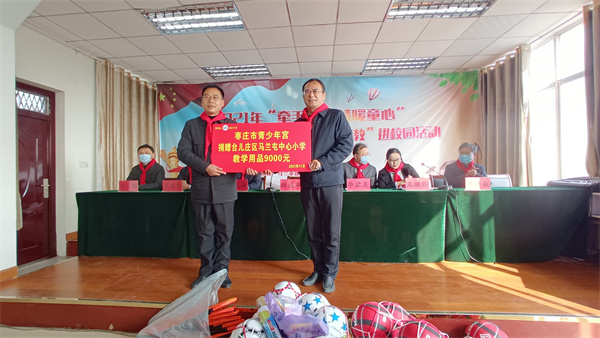 在此次活动的开幕式上,市青少年宫向马兰屯镇中心小学捐赠价值9000元的音响等教学器材。同时,枣庄市新阶联也为该小学捐赠了一批体育器材。