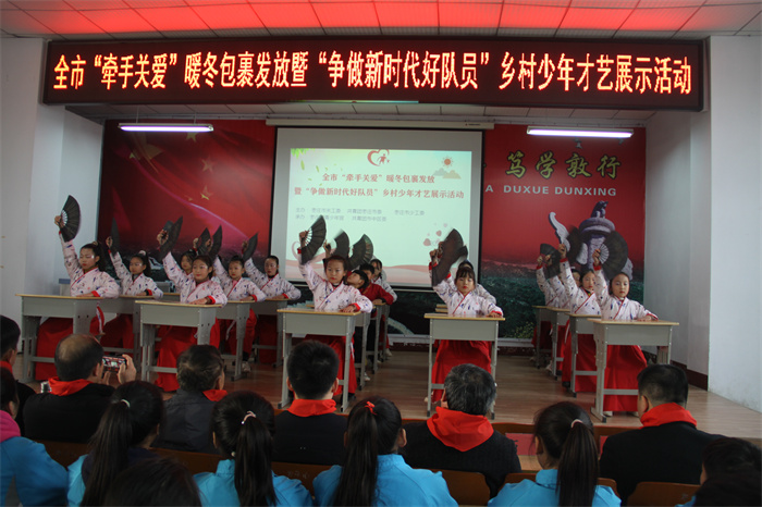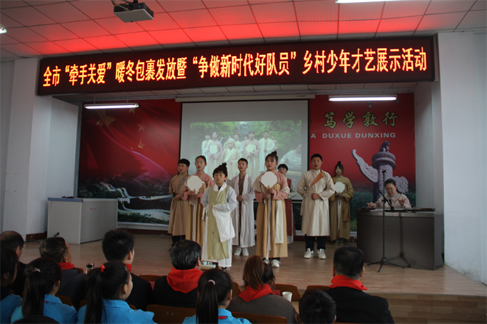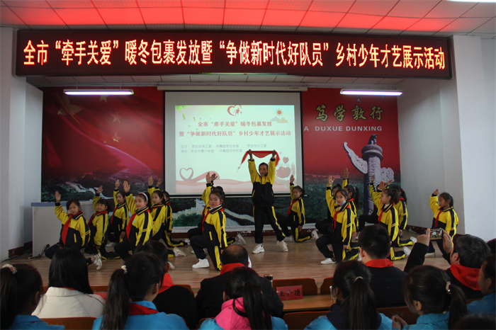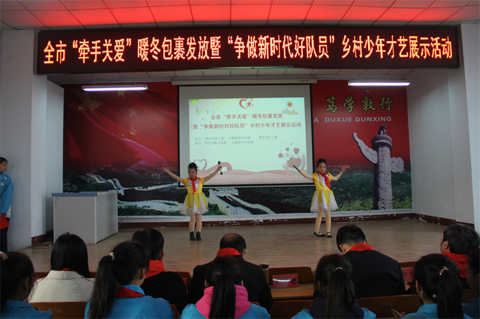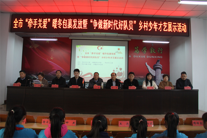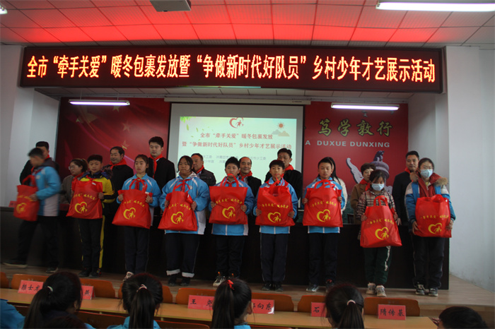 为进一步深化“我为青少年办实事”,提升“牵手关爱”行动品牌效应,切实为广大青少年办实事、办好事,为农村留守、困境少年儿童送去冬日温暖,同时,为农村少年儿童搭建展示风采的舞台,热情讴歌伟大的中国共产党百年奋斗历程和百年辉煌成就。1月7日上午,由市关工委、团市委、市少工委联合主办,市青少年宫、区关工委、团区委、区青年志愿者协会、聚力青年公益发展中心承办的“牵手关爱·情暖童心”暖冬包裹发放暨“争做新时代好队员”乡村少年才艺展示活动在市中区永安镇龙子心中学成功举办,区关工委常务副主任兼秘书长王广德、市少年宫主任种燕、团区委书记王尧及市青少年宫、区教体局、永安镇相关领导出席。