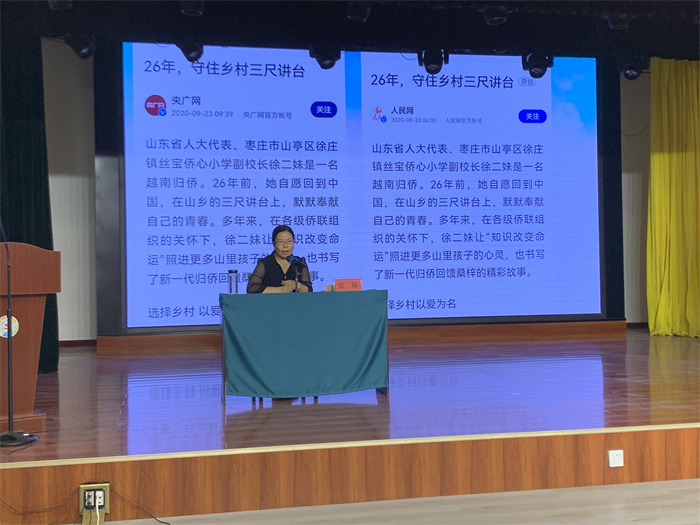 “作为一个老师,看到自己的学生在自己的教育下不断的进步,不断的获取知识,感到很开心很欣慰,自己是知识的传播者,从而收获了满满的自豪感和成功感”。这是一位坚守在偏僻山村26年的归侨女教师发自内心的感慨。徐二妹——一个平平凡凡的名字,一位普普通通的教师,用努力辛勤的付出,让山里的孩子走出去实现自己的梦想,改变自己的命运。6月23日,应枣庄市青少年宫、枣庄市新的社会阶层人士联谊会邀请,山亭区徐庄镇丝宝侨心小学副校长徐二妹在市青少年宫梦想剧场做了一场专题报告会。徐老师用自身26年的从教经历,完美诠释了一名归国华侨怎样为山村的孩子改善教育生活环境、乡村教育振兴奉献青春、汗水和心血。多年来,徐老师尽心精心费心打造高效的教学课堂,为改变学校的教学环境呕心沥血,为改善学校办学条件奔波,为农村贫困孩子奉献爱心,尽最大努力去帮助每个孩子,让“知识改变命运”照进更多山里孩子的心灵,书写了新一代归侨回馈桑梓的精彩故事。同时,作为一名人大代表、政协委员,徐老师认真履行代表和委员的职责,在做好教育教学工作的同时,经常到村民家中广泛收集社情民意,积极建言献策。