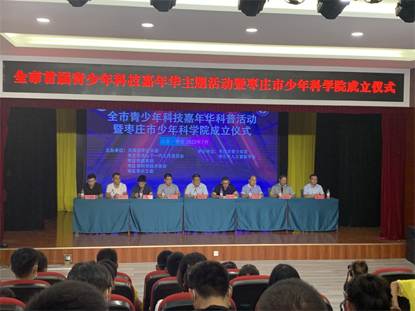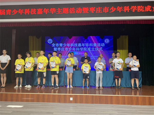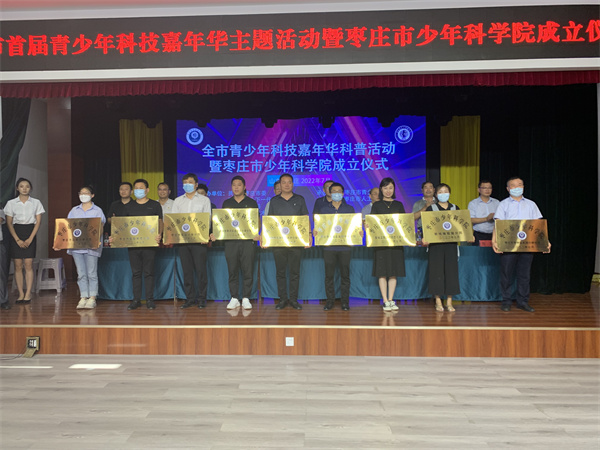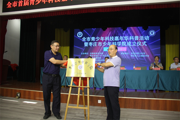 团市委副书记、市少工委主任赵波和市老科技工作者协会副会长、市少年科学院名誉院长王胜黎为枣庄市少年科学院揭牌,出席领导向枣庄市少年科学院各分院授牌。