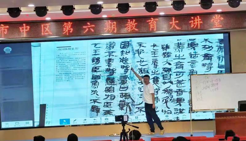 市中区教体局马睿主任谈了一个认识、一个感受。书法是文化,是修养,更是抽象的哲学,简单把写字当成书法是错误的观点。马老师的课很实用,让我们听者很受用。不要因为我们认识受限,限制了我们对美的认知,影响了我们教学的养分。最后,通过六个关键问题进行培训成果测试,大家积极踊跃回答,培训者学有所得。希望通过培训,老师们在教学中践行新课标全方位育人的上位思想。