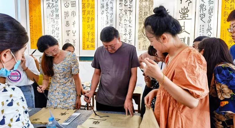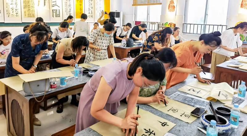 培训期间正值高温,开着空调尚且挥汗如雨,但老师们学习的积极性丝毫不减。马老师汗湿了衣衫,仍忘我地为老师们讲解;老师们一边擦汗,一边虚心求学,尽心练习。 师生孜孜以求的学习场面,让我们看到了书法教育的诗和远方,感谢这些愿意擦亮星星的教育者。