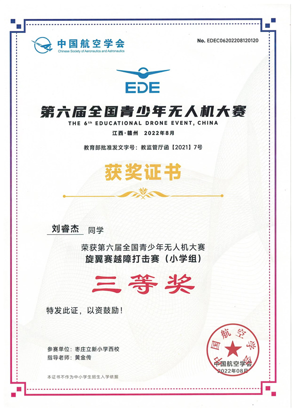 近日,由中国航空学会主办的第六届全国青少年无人机大赛在江西省赣州市南康区体育馆拉开帷幕。枣庄市少年科学院小院士刘睿杰、刘海皓两位优秀选手经过激烈角逐,勇夺“旋翼越障打击赛”国赛三等奖和山东省赛一等奖。