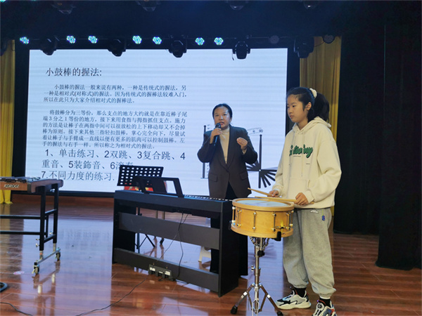 讲座活动在主持人邱文文的钢琴声中拉开序幕。杜娟老师从音乐的三大要素开始,讲出节奏在音乐的重要性。简述什么是节奏,如何训练节奏,重点讲授小军鼓在打击乐中的地位和技术技巧展示,以及当前打击乐的发展方向和高校打击乐教学要求做简单说明。