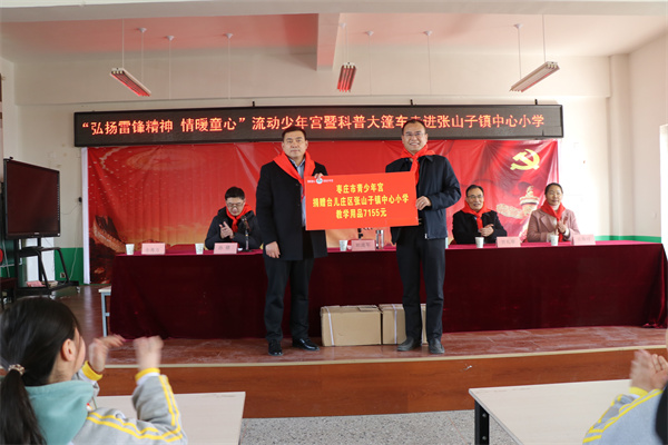 市青少年宫、市科技馆同志分别向学校捐赠了文体用品和图书,少先队员向参会的老师们佩戴红领巾,志愿者组织学校师生唱国歌,增强少先队员的爱国热情。李荣国老师带领同学们进行学雷锋宣誓活动,聚焦雷锋精神的实质内涵开展专题宣讲,引导学生自觉主动地关注雷锋精神,在校内形成学雷锋的氛围,激励同学们做一名思想好、学习好、品德好的优秀少年。