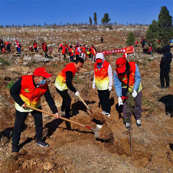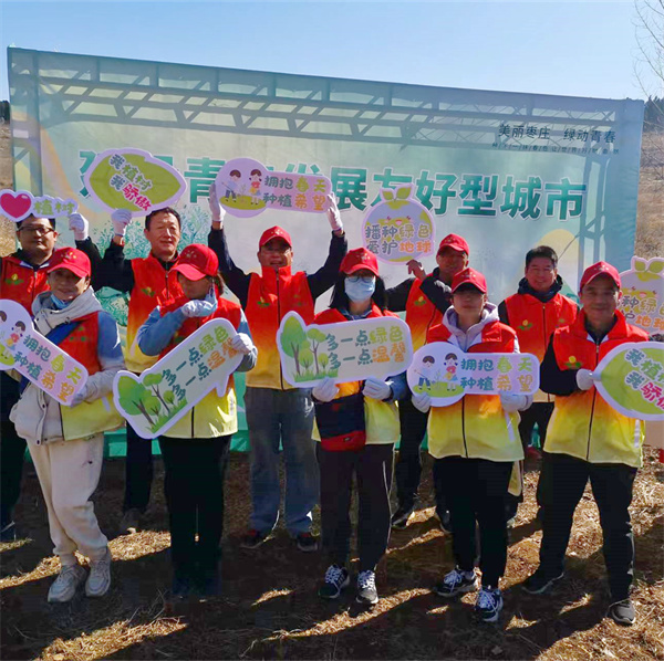 鲜红的旗帜迎风飘展,艳丽的服装引人注目。在滕州市柴胡店镇家山植树基地,市青少年宫志愿者身着志愿者服装,参加由共青团枣庄市委、枣庄市林业和绿化局联合开展的“美丽枣庄 绿动青春”植树活动。