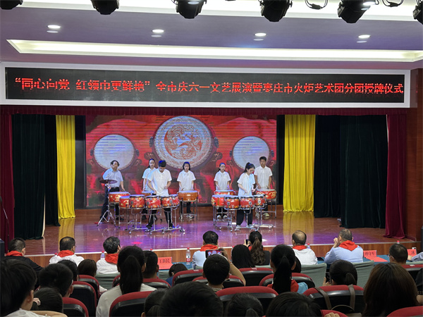在枣庄市实验学校的庆祝六一国际儿童节少先队员献词中,“同心向党 红领巾更鲜艳”枣庄市“庆六一”文艺展演拉开帷幕。市青少年宫打击乐团带来的《盛世龙腾》展现了中华民族打击乐民族风格和独有的艺术表现力;五月榴花红似火,金秋石榴满树果,市立新小学舞蹈团带来的《小小石榴籽》生动诠释了“像石榴籽那样紧紧抱在一起……就一定能凝聚起一往无前的磅礴力量,就一定能实现第二个百年奋斗目标、实现中华民族伟大复兴的中国梦!”市中区实验小学在山东省中小学生戏剧比赛中获奖的课本剧《七色花》展现了课堂教学与艺术教学的相结合的成果;青少年宫好声音播音主持同学们带来的诗歌朗诵 《满江红 》表达了孩子们继承发扬“精忠报国”的精神遗产;滕州市第二实验小学、薛城区实验小学和薛城区临山小学带来的样板戏《薪火相传》、舞蹈《敦煌乐鼓》和京剧《梨花颂》展示了民族文化艺术在校园的传承;枣庄市青少年宫的原创歌曲《天然红》多次荣获国家级、省级创作奖,作品以活泼热情,蓬勃高亢的旋律,号召广大少年儿童传承红色基因,讴歌了伟大的新时代。