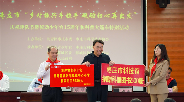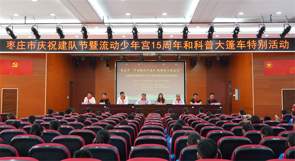 为贯彻落实山东省青少年宫协会《关于开展“乡村振兴手拉手 砥砺初心再出发”流动少年宫15周年再出发特别活动》通知精神的具体举措,充分发挥我市青少年校外教育和科普阵地“流动少年宫和科普大篷车”的资源优势,助推教育城乡一体化高质量发展的实际行动,10月 11日,市青少年宫在薛城区邹坞镇中心小学举办“乡村振兴手拉手 砥砺初心再出发”庆祝建队节暨流动少年宫15周年和科普大篷车特别活动。共青团市委副书记赵波、市科协副主席项菲、薛城区人民政府副区长孙发伟、市青少年宫主任种燕、薛城团区委书记王帅、薛城区科协主席闫茂文、薛城区教体局副局长张庆余,邹坞镇党委副书记杨树等领导参加活动。
