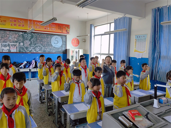 参加活动的领导老师们一起戴上鲜艳的红领巾,在全体少先队员嘹亮的《中国少年先锋队队歌》歌声和辅导员与全校少先队员一起“准备着--为共产主义事业而奋斗!”激情呼号声中,仪式正式开始。全体人员庄严地齐唱《中华人民共和国国歌》使仪式感达到高潮。全体少先队员展示了胸怀成才之志,永远听党话、跟党走,争做德智体美劳全面发展的时代新人,为实现中华民族伟大复兴的中国梦,为建设社会主义现代化强国“时刻准备着”的铿锵誓言!