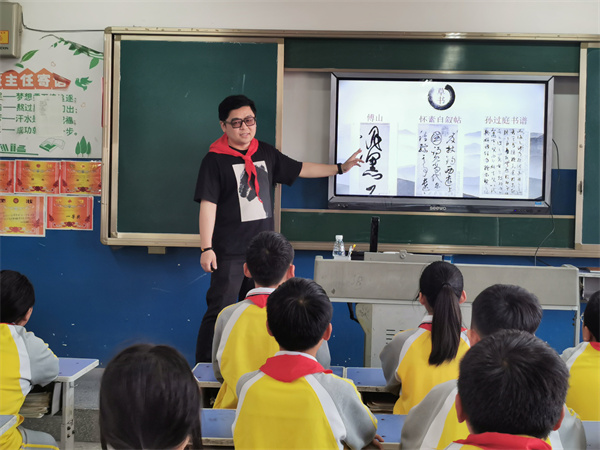 枣庄市青年书法家协会副秘书长张卓参加了本次公益活动。书法公益课堂上,张老师给学生们讲授了中华优秀传统中的书法发展史、书法艺术现代发展以及教授了基本的书法运笔技巧和章法要领。