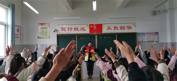 参加活动的领导和老师们共同戴上鲜艳的红领巾,在雄壮的《中华人民共和国国歌》歌声中,全体共青团员展现了胸怀成才之志,永远听党话、跟党走,争做德智体美劳全面发展的时代新人,为实现中华民族伟大复兴的中国梦,为建设社会主义现代化强国“时刻准备着”的铿锵誓言!