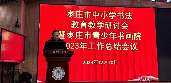 12月20日下午,枣庄市首届中小学书法教学研讨会暨2023年枣庄市青少年书画院工作总结会议在滕州市北辛中学通盛路校区召开。来自全市书法教育战线及滕州市教体局、北辛联区、北辛中学通盛路校区师生代表共五百余人参加了会议。