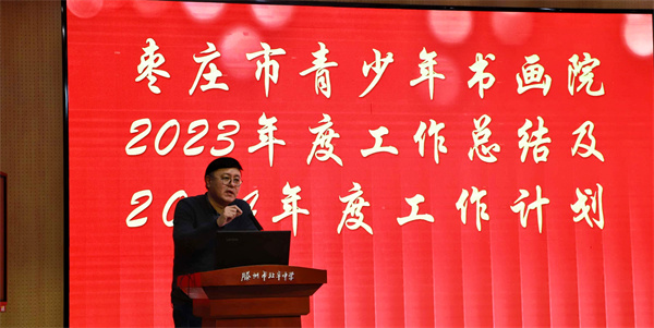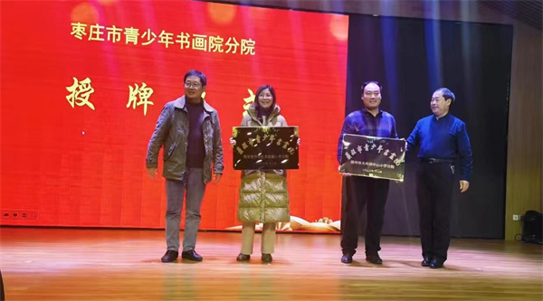枣庄市教科院常务副院长单波同志,枣庄市青少年宫副主任郭向东同志为市中区东湖小学、市中区文化路小学、滕州大坞镇中心小学、滕州北辛中学等第二批枣庄市青少年书画院分院授牌。枣庄市青少年书画院院长、枣庄市教科院兼职书法教研员马德田作枣庄市青少年书画院2023年度工作总结。2023年青少年书画院坚持传承优秀传统文化、提升校园书画教育水平为指引,先后举办了3次书画艺术进校园活动,青少年书画院第二届作品展,两期书法教师公益培训等活动。2024年,市青少年书画院将在市教科院的指导下组建全市中小学书法教学团队,不断提升全市的书法教学水平,同时,以各分院为阵地,做好各学校的书画社团工作并邀请更多的书画名家进校园,举办全市书法教学优质课评比活动,举办全市教育系统中小学师生书法大展暨青少年书画院第三届院展,以此检验全市中小学书法教学成果。