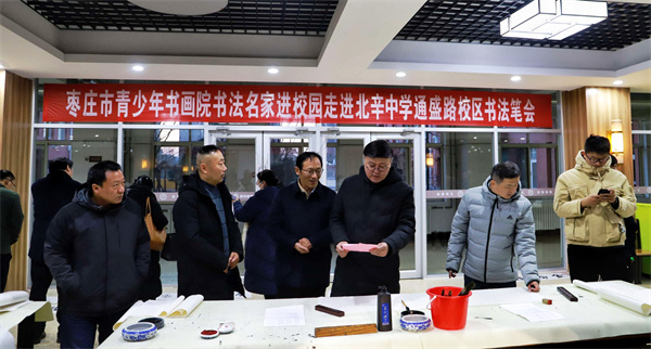 最后,与会领导和老师们参观枣庄市青少年书画院北辛中学分院学生书画展览和翰墨先锋书法社团并在学校知书厅举行了“枣庄市青少年书画院书法进校园书法名家笔会”活动,书法家马德田、顾全臣、宋刚、李川东、孔璐等挥毫泼墨,展示书法艺术风采。