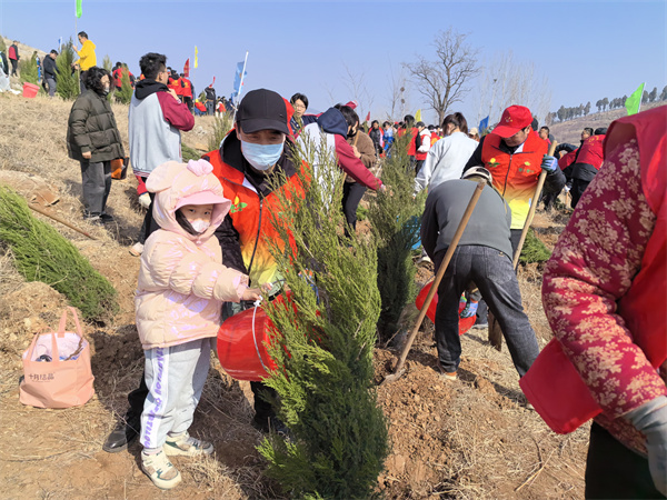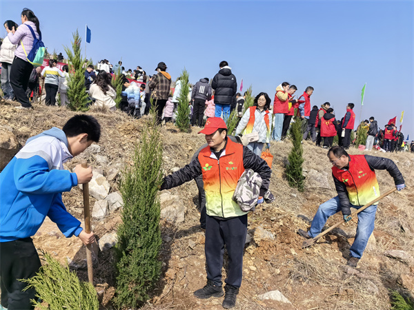 挥锹铲土,扶苗填坑,提水浇树······在滕州市柴胡店镇家山东北侧,大家一到现场就展开了忙碌有序的植树活动,沿着山坡种下一棵棵树苗,栽下行行新绿。树苗错落有致,迎风挺立,原本荒凉的大地立即充满生机与活力。