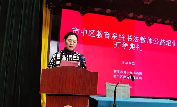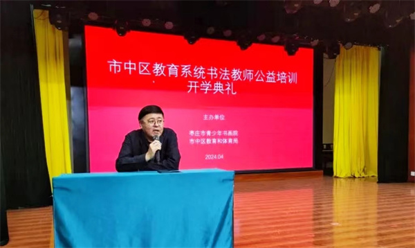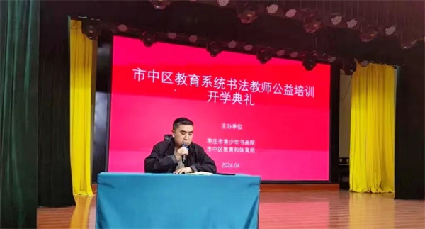 根据《山东省教育厅关于加强规范书写汉字工作的指导意见》及省、市2024年小学书法教师“双姿”展示活动的通知要求,为弘扬中华民族优秀传统文化,加强师资队伍建设,枣庄市青少年宫、枣庄市青少年书画院和市中区教体局联合举办的书法教师公益培训班,于4月13日在市青少年宫梦想剧场开班。来自市中区各中小学四十余名书法教师将参加为期九个月的公益培训。市青少年书画院院长马德田,市青少年书画院执行院长、市教科院美术调研员杨小勇,市青少年书画院艺术指导宋刚,市青少年书画院副院长孔路进行了授课。