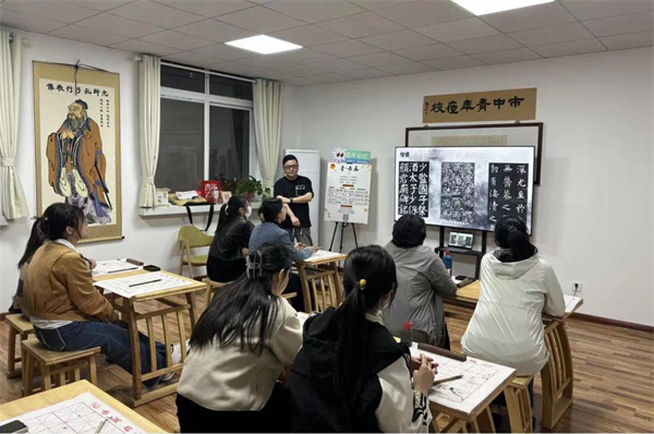 墨子书法的张老师和孔老师,向学员们阐述了篆隶楷行草五大书体的演变与划分,让学员们知晓从什么书体入手,从哪本字帖开始练习,学员们也体验了不同书体的书写要点。
