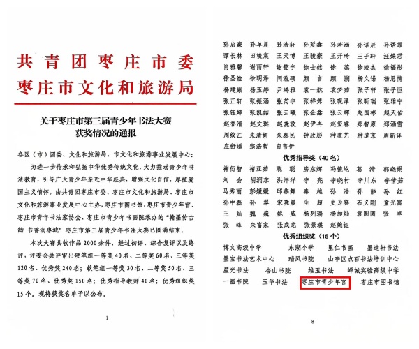 为进一步传承和弘扬中华优秀传统文化,大力推动青少年书法教育,引导广大青少年亲近中华经典,增强文化自信,厚植爱国主义情怀,由共青团枣庄市委、枣庄市文化和旅游局、枣庄市文化和旅游事业发展中心主办,枣庄市图书馆、枣庄市青少年宫、枣庄市青年书法家协会、枣庄市青少年书画院承办的“翰墨传古韵 书香润枣城”枣庄市第三届青少年书法大赛已圆满结束。枣庄市青少年宫在此次大赛中荣获优秀组织奖。
