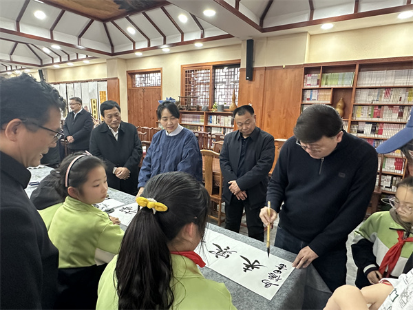 建设路小学校长致辞并汇报学校甲骨文工作开展情况;枣庄市书协主席介绍枣庄市青少年书画院工作开展情况;与会人员观看了建设路小学诗书诵读节目,对社团参观指导。书法家与优秀学生舞墨联欢。