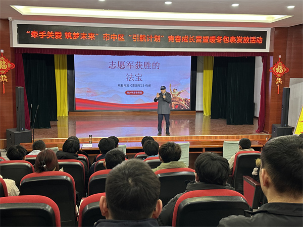 活动伊始,主持人以饱含深情的话语拉开序幕,向在场青少年传递成长的期许:“成长是一场不断探索的旅程,今天我们将在光影与歌声中汲取力量,在故事与关爱中明确方向。”随后,市青少年宫经典诵读专业教师带来精彩分享,结合《让红色基因在我们身上继续闪光》主题,深入解读红色影片《志愿军2》背后的历史细节,通过铁原阻击战、上甘岭坚守等经典战役片段,生动诠释了志愿军“钢铁般的信念”与“千方百计完成任务”的奋斗精神,让同学们在历史叙事中触摸先辈们为家国理想挺身而出的滚烫初心,续写属于这一代人的青春华章,让红色基因在新时代绽放新的光芒。