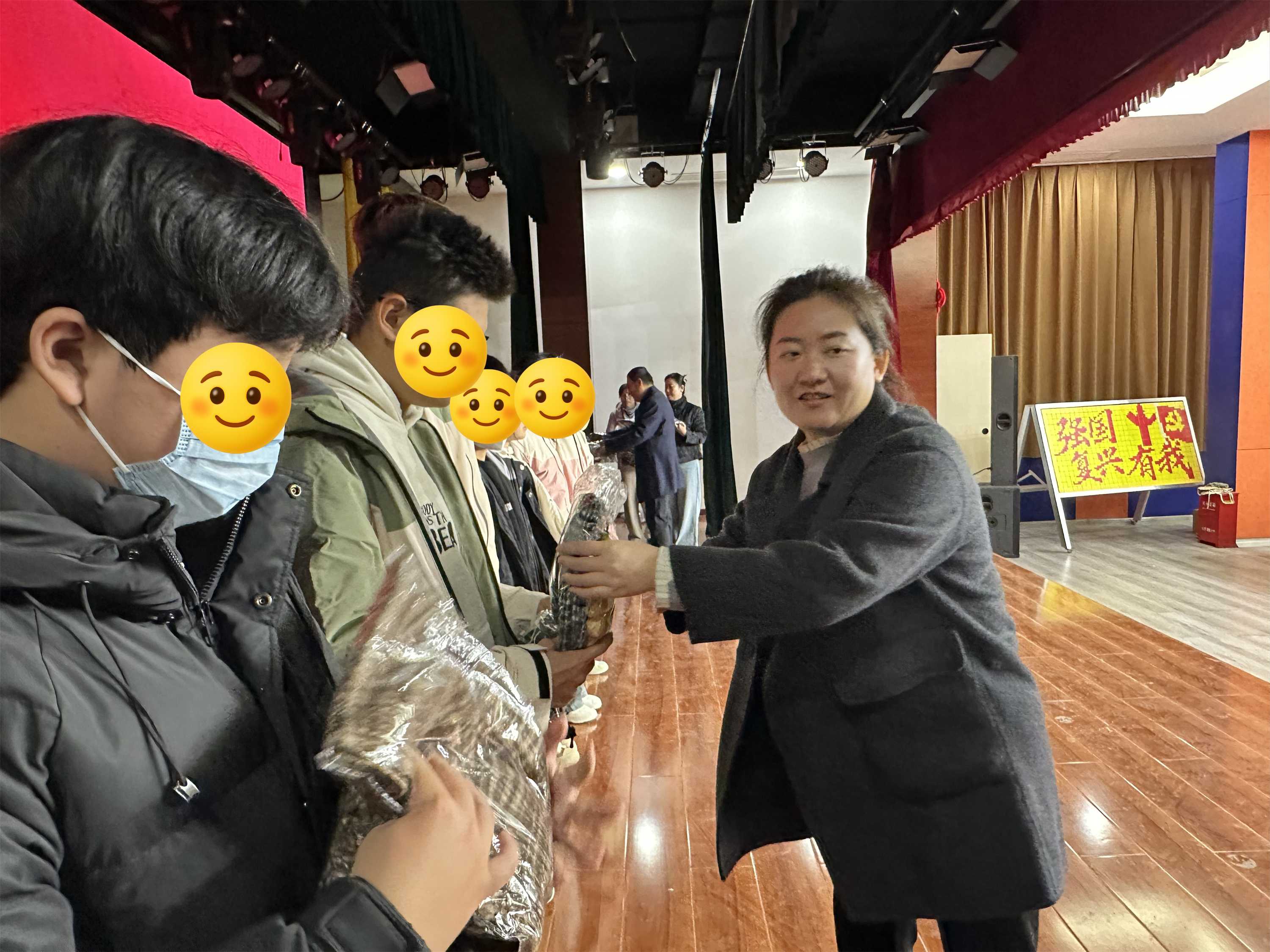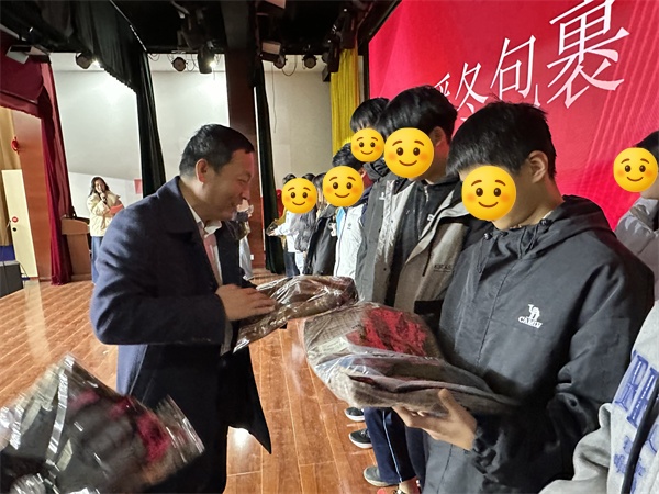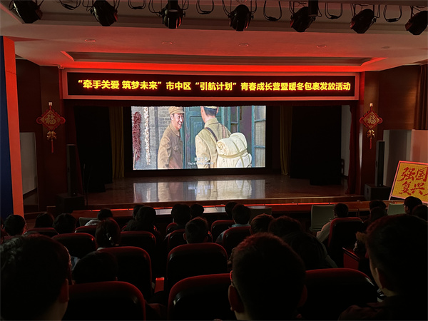 观影结束后,温暖时刻如期而至,青少年宫负责人与团区委负责同志共同为同学们送上“暖冬包裹”。这份满载关怀的礼物不仅驱散了冬日寒意,更传递着对青少年成长的殷切期望,同学们上台领取礼物并合影留念,定格下温馨瞬间。
