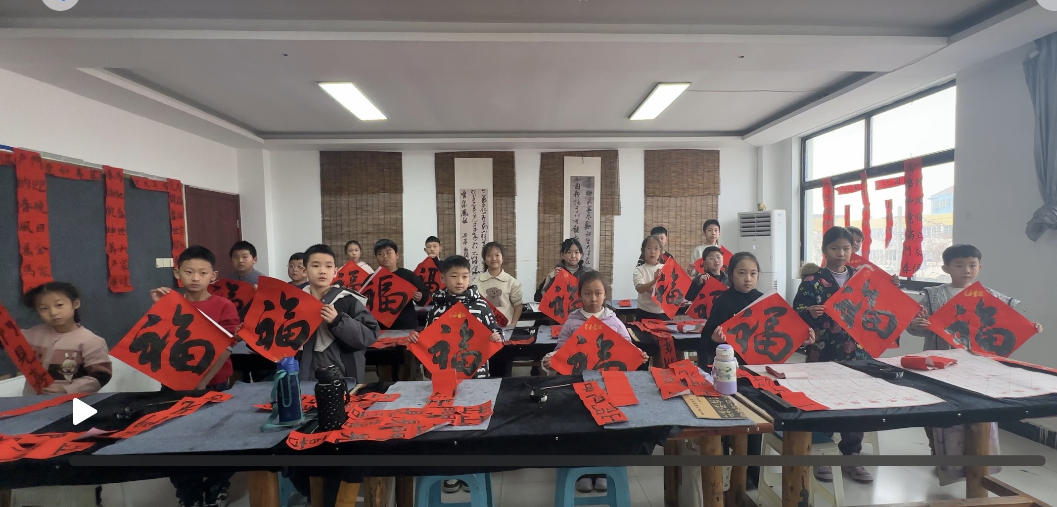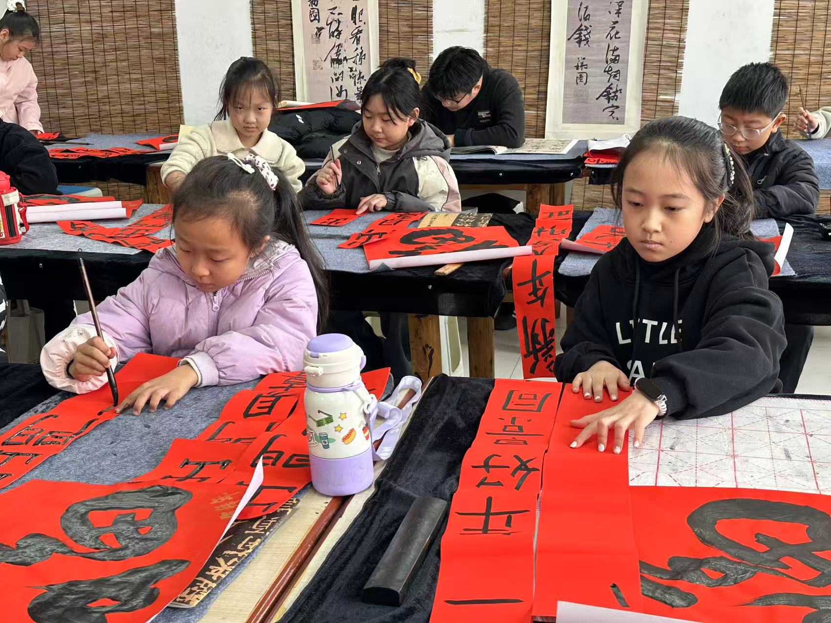 活动伊始,书法教师围绕春联的文化渊源、平仄对仗、章法布局及书写技巧展开细致讲解,随后,学员们化身“小小书法家”,端坐案前、凝神静气,提笔、蘸墨、运笔、落笔一气呵成。一幅幅寓意吉祥的春联佳句跃然纸上、一个个方正饱满的“福”字墨韵十足,红彤彤的铺满展示区,浓浓的年味扑面而来。