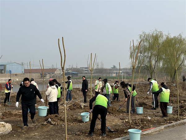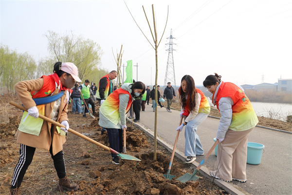 活动现场,志愿者们热情高涨、干劲十足。大家手持铁锹、水桶,分工协作,挥锹铲土、扶苗培土、提水浇灌,每一道工序都细致认真。泥土沾满鞋袜,汗水浸湿衣衫,却无人停下手中的动作。经过一上午的辛勤劳动,百余株新栽的树苗在沙河湿地畔迎风挺立,为初春的枣庄增添了一片生机勃勃的新绿。“亲手为家乡的土地添上一抹新绿,我感到由衷的自豪。这不仅是在履行一名公民的责任,更是为我们的后代播种希望,守护未来能够仰望的蓝天。”参与活动的志愿者望着阳光下挺立的新苗,充满对绿色未来的憧憬与信心。
