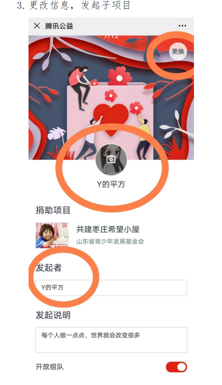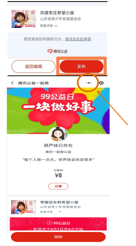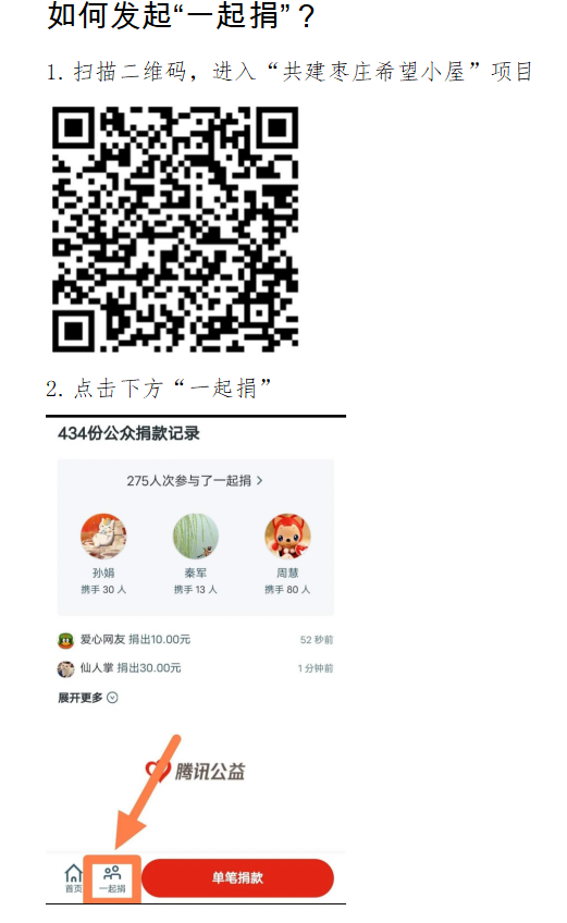 2.广泛开展网上募捐。“希望小屋”网上“一起捐”是共青团工作思维转型、探索社会化、网络化动员的新方式。各单位团干部要主动作为,以个人或集体名义带头发起希望小屋“一起捐”(“一起捐”详细操作流程见附件),全力冲击9月7日—9日“希望小屋”腾讯公益活动。