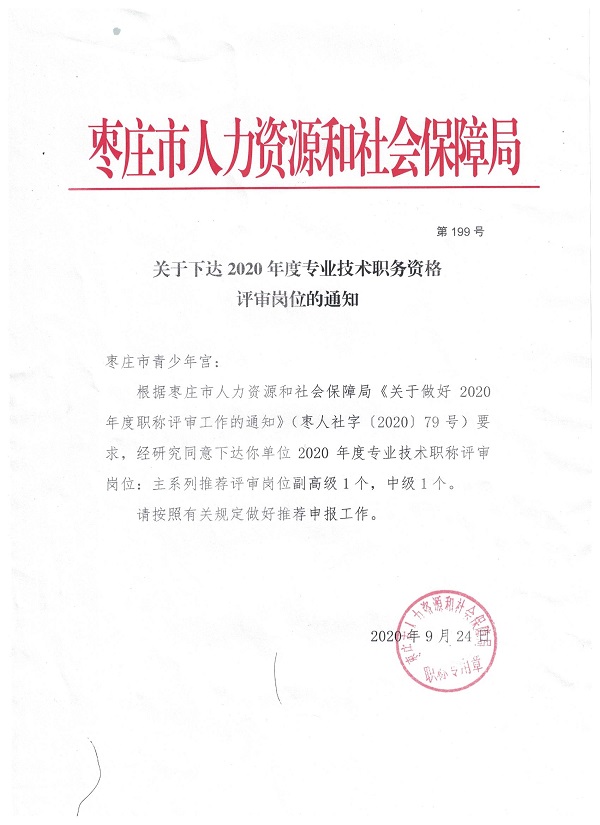 枣庄市人力资源和社会保障局《关于下达2020年度专业技术职务资格评审岗位的通知》